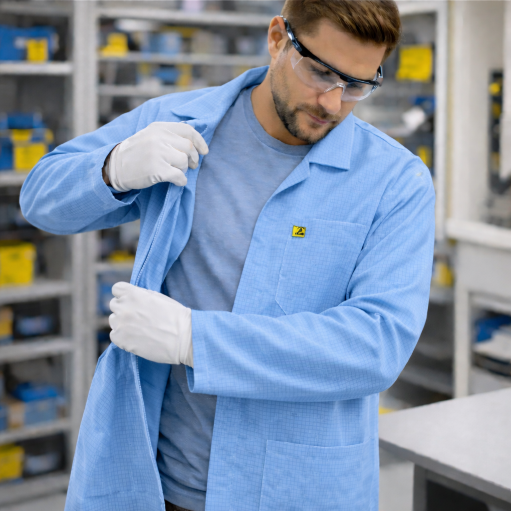 O jaleco ESD é de poliéster dissipativo. Utilizado para evitar a geração de carga eletrostáticas pelo usuário, em ambientes onde há manuseio de objetivos que sejam sensível a energia estática.
