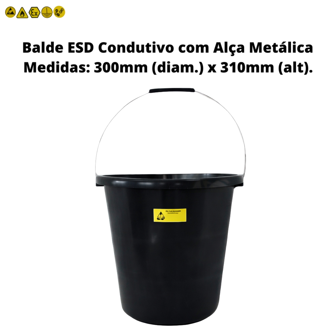Fabricado em polipropileno condutivo, o Balde ESD oferece segurança ao manipular líquidos inflamáveis em áreas potencialmente explosivas (EX) e outros ambientes que requerem controle rigoroso de descargas eletrostáticas. Equipado com alça metálica para facilidade de transporte, possui resistência superficial inferior a 1x10E6 Ω/sq. conforme normas NR10 e NFPA 77.