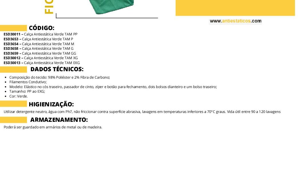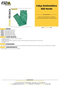 Ficha técnica Calça Antiestática ESD Verde