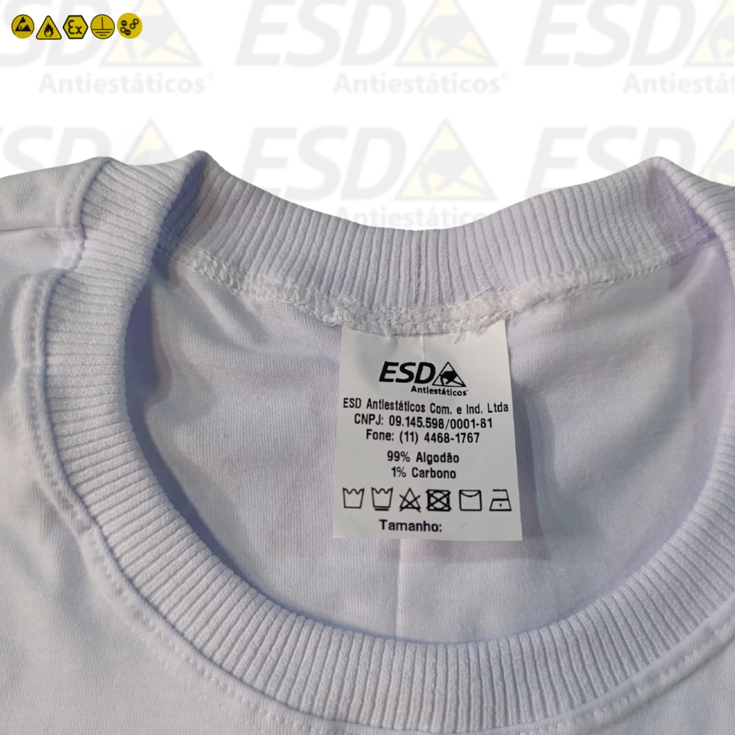 Camiseta ESD de Algodão. Uniforme desenvolvido especialmente para garantir maior segurança durante a manutenção de equipamentos eletrônicos, impedindo que ocorram danos em razão da energia estática.