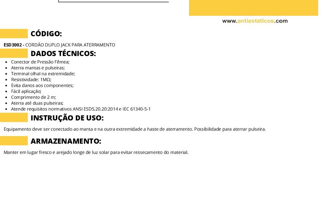 Ficha técnica Cordão ESD Duplo Jack para Aterramento por ESD Antiestáticos | maio 19, 2025 | 0 ComentáriosEnviar Comentário Cancelar respostaO seu endereço de e-mail não será publicado. Campos obrigatórios são marcados com *Comentário *Nome * E-mail * Site Salvar meus dados neste navegador para a próxima vez que eu comentar. Δ