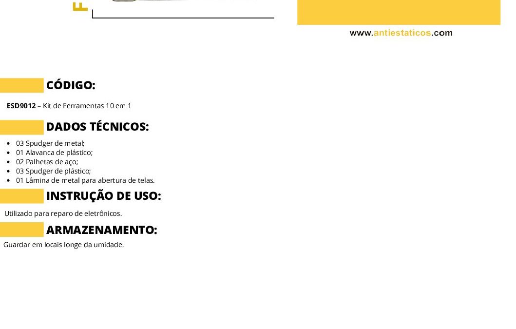 Ficha técnica Kit de Ferramentas 10 em 1 para Reparo Eletronicos por ESD Antiestáticos | set 8, 2025 | 0 ComentáriosEnviar Comentário Cancelar respostaO seu endereço de e-mail não será publicado. Campos obrigatórios são marcados com *Comentário *Nome * E-mail * Site Salvar meus dados neste navegador para a próxima vez que eu comentar. Δ