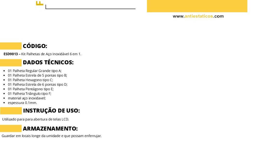 Ficha técnica Kit de Palhetas de Aço Inoxidável 6 em 1 por ESD Antiestáticos | set 8, 2025 | 0 ComentáriosEnviar Comentário Cancelar respostaO seu endereço de e-mail não será publicado. Campos obrigatórios são marcados com *Comentário *Nome * E-mail * Site Salvar meus dados neste navegador para a próxima vez que eu comentar. Δ