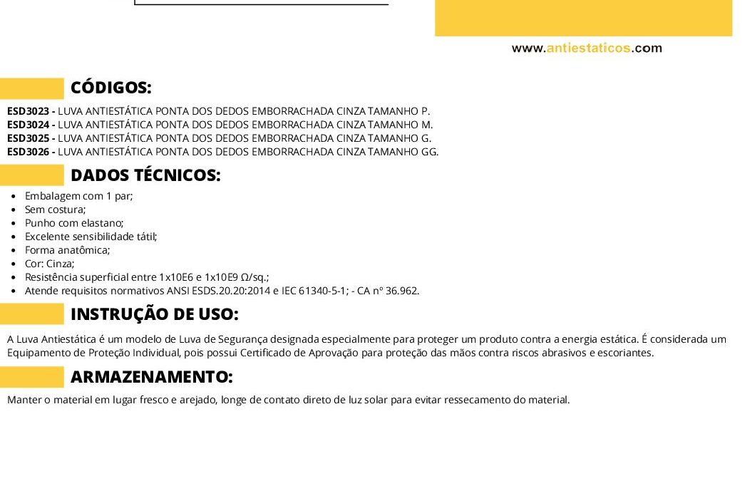 Ficha Técnica LUVA ESD CINZA PU PONTA DOS DEDOS por ESD Antiestáticos | maio 27, 2025 | 0 ComentáriosEnviar Comentário Cancelar respostaO seu endereço de e-mail não será publicado. Campos obrigatórios são marcados com *Comentário *Nome * E-mail * Site Salvar meus dados neste navegador para a próxima vez que eu comentar. Δ