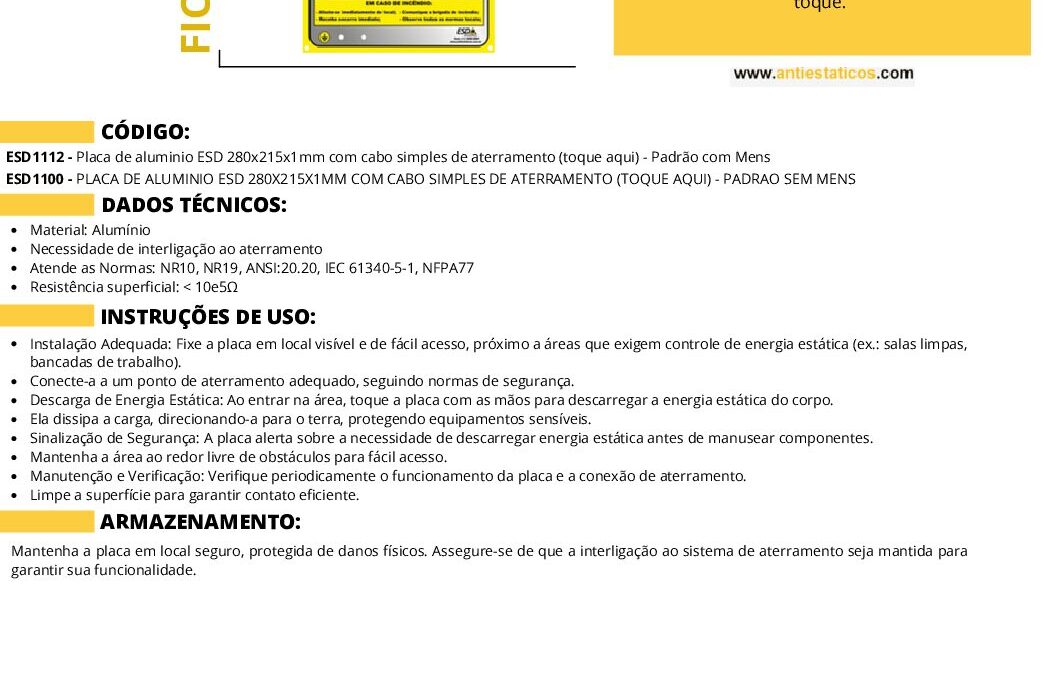 Ficha técnicaPLACA DE SINALIZAÇÃO E DESCARGA DE ENERGIA ESTÁTICA por ESD Antiestáticos | ago 14, 2025 | 0 ComentáriosEnviar Comentário Cancelar respostaO seu endereço de e-mail não será publicado. Campos obrigatórios são marcados com *Comentário *Nome * E-mail * Site Salvar meus dados neste navegador para a próxima vez que eu comentar. Δ