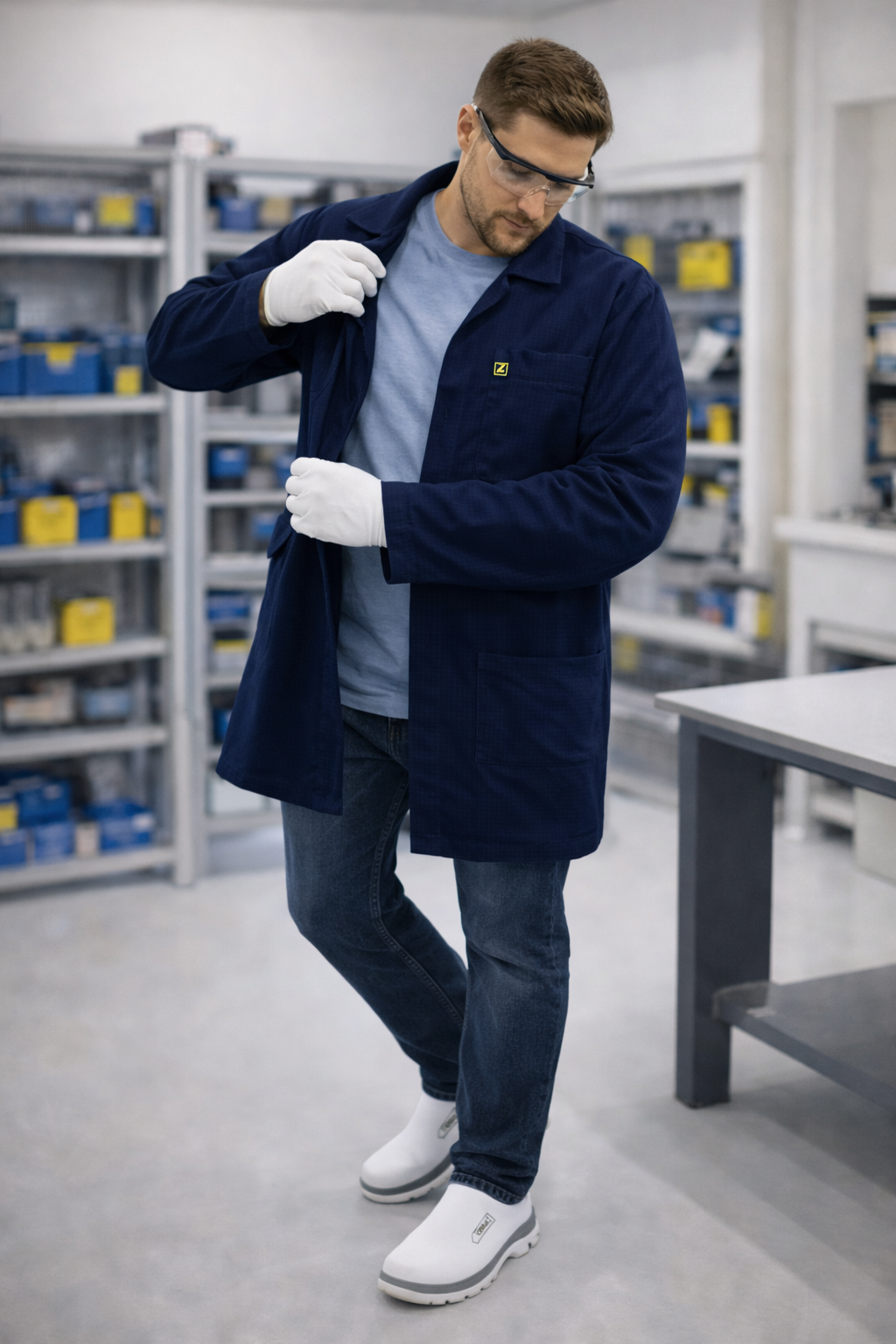Calçado ESD tipo tênis, cabedal confeccionado em vaqueta hidrofugada relax, palmilha de montagem, palmilha interna higiênica removível e lavável, solado bidensidade, resistente a óleos combustíveis, injetado direto no cabedal com propriedades antiestáticas.