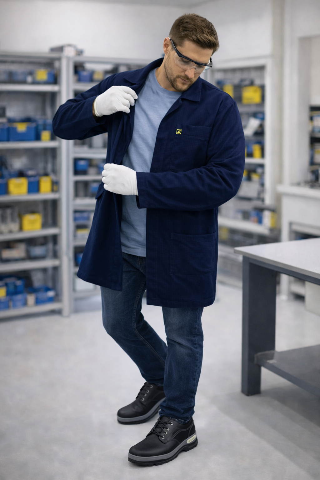 Calçado ESD tipo tênis, cabedal confeccionado em vaqueta hidrofugada relax, palmilha de montagem, palmilha interna higiênica removível e lavável, solado bidensidade, resistente a óleos combustíveis, injetado direto no cabedal com propriedades antiestáticas.