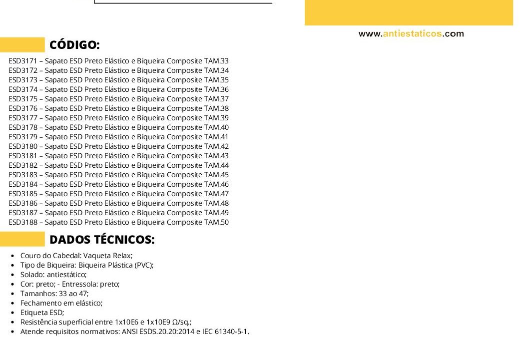 Ficha técnica Sapato ESD Preto Elástico e Biqueira Composite por ESD Antiestáticos | maio 21, 2025 | 0 ComentáriosEnviar Comentário Cancelar respostaO seu endereço de e-mail não será publicado. Campos obrigatórios são marcados com *Comentário *Nome * E-mail * Site Salvar meus dados neste navegador para a próxima vez que eu comentar. Δ
